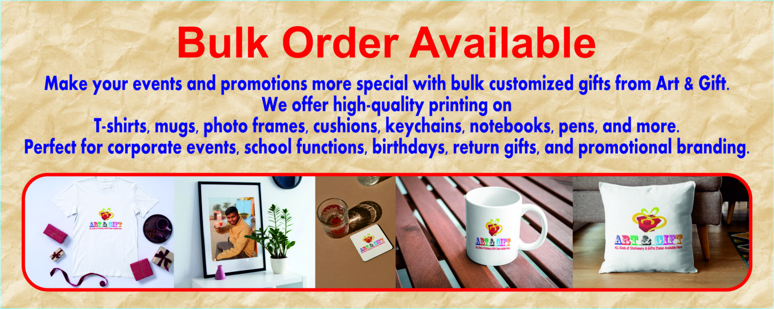 we offer high-quality bulk customized printing for businesses, schools, events, and corporate promotions. From custom mugs, t-shirts, keychains, water bottles, notebooks, and certificates to many other personalized products, we ensure premium printing, vibrant designs, and consistent quality.